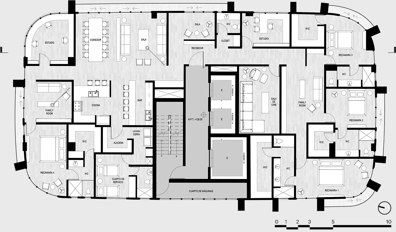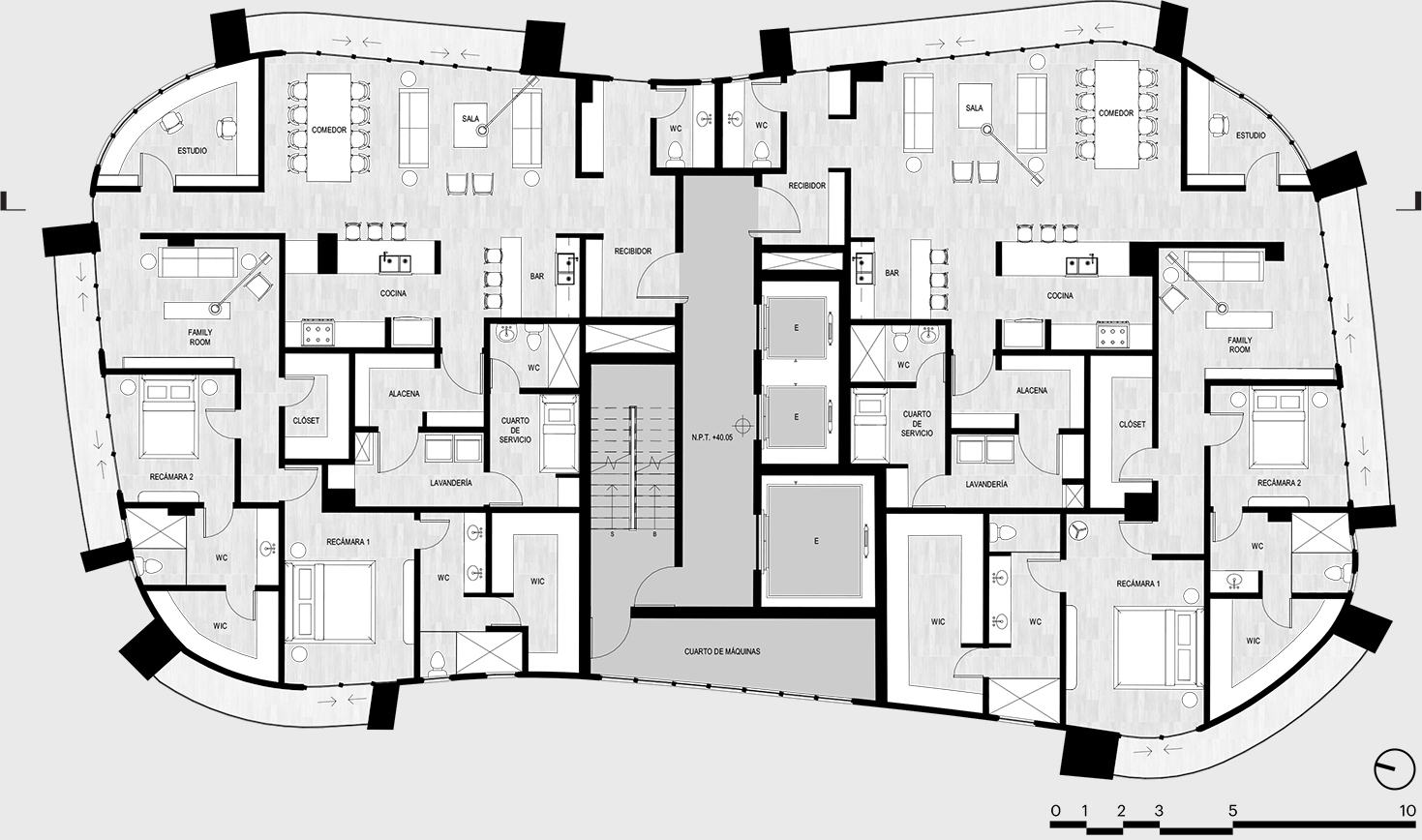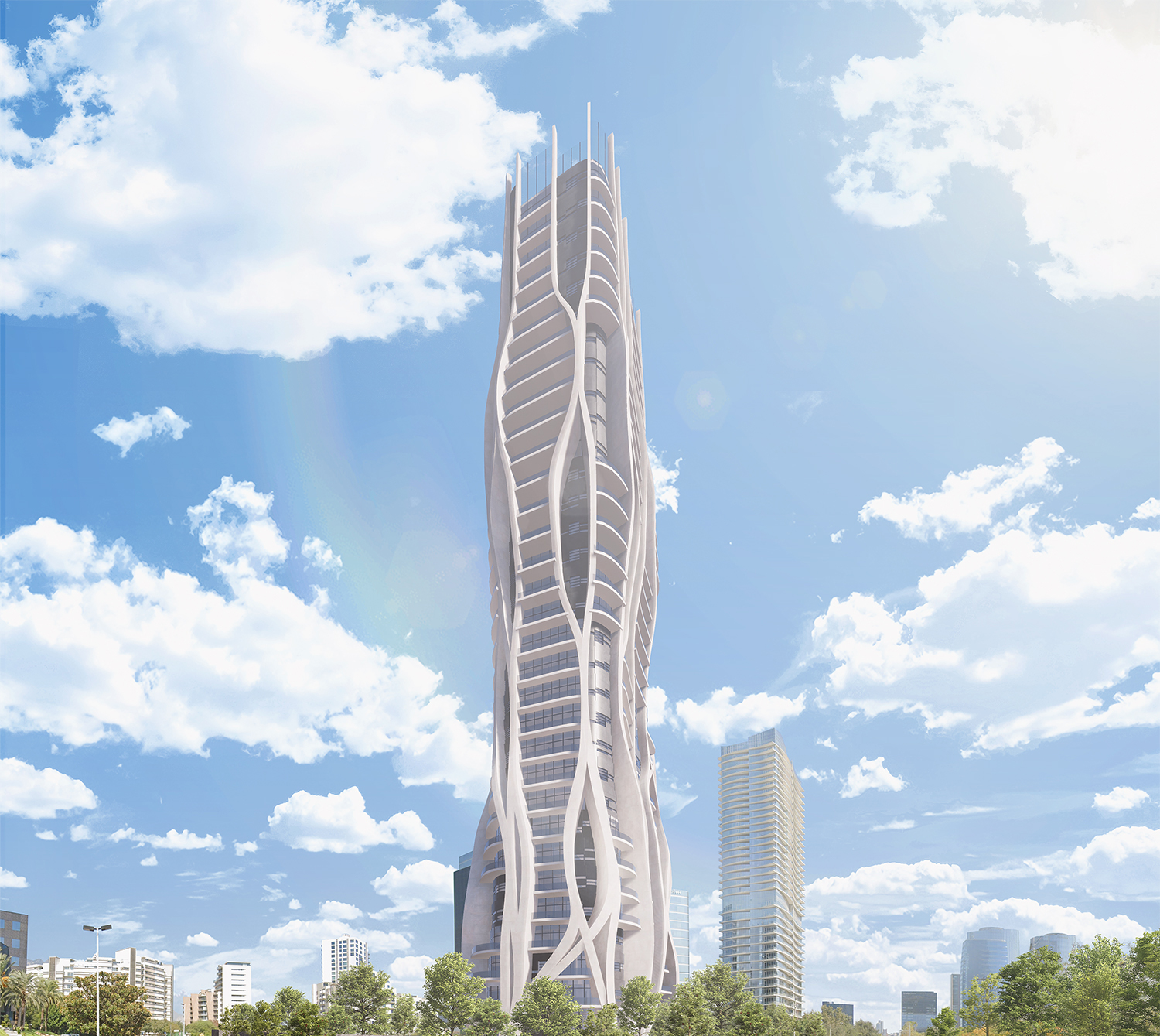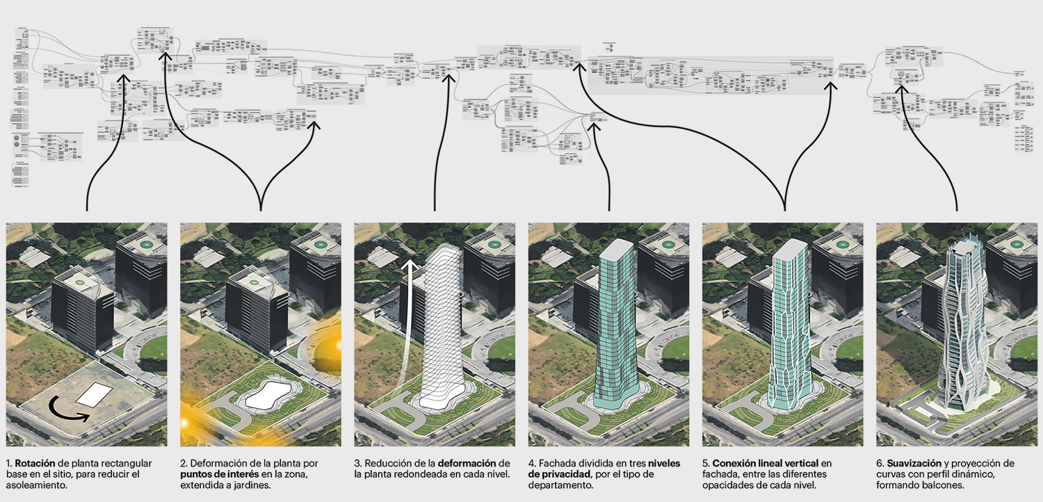 Entre edificios fríos y desprendidos, la torre provee de espacios generados con una elegancia de inspiración natural, provenientes a su vez de un proceso algorítmico de diseño que vincula al proyecto visual y lógicamente con su contexto. Dicho proceso surge de parámetros que abarcan desde la radiación solar y análisis de vistas, hasta el programa y la privacidad requerida por los tres tipos de departamentos disponibles; concentrando el diseño de la torre en un algoritmo, que le permite responder dinámicamente a sus usuarios y entorno.